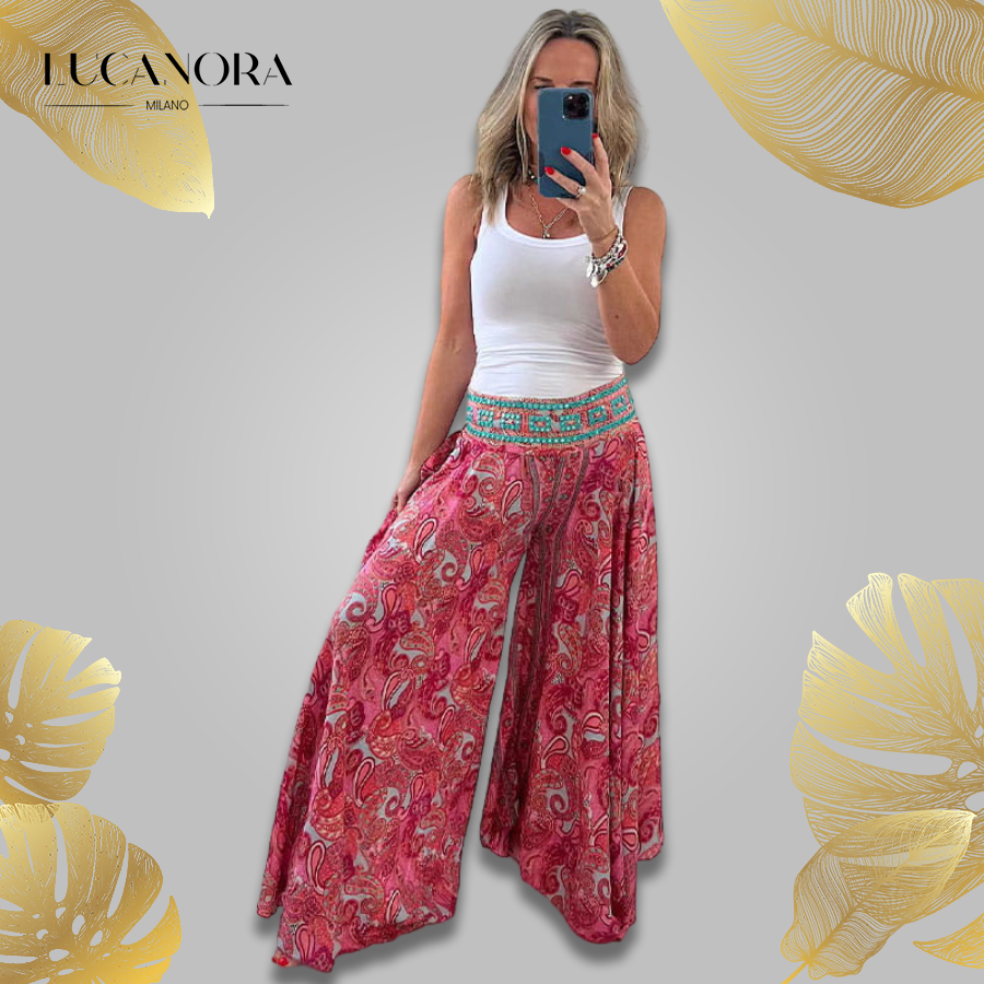 Ezek nem egy szokványos nadrágok – élénk etnikai mintájukkal és laza szabású, széles szárukkal úgy tervezték, hogy bárhová is mész, benyomást keltsenek. Az elasztikus derékpánt tökéletes illeszkedést biztosít, míg a könnyű anyag egész nap hűvös és kényelmes viseletet biztosít.