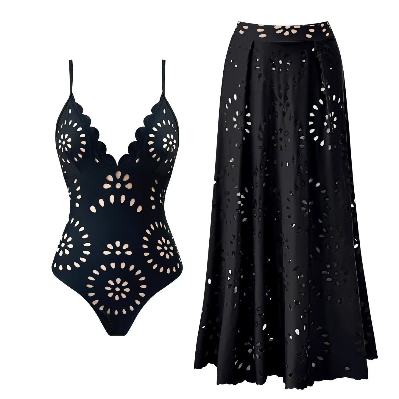 - Részletek: Virágmintás kivágás, egyrészes fürdőruha hozzáillő, bokáig érő szoknyával.