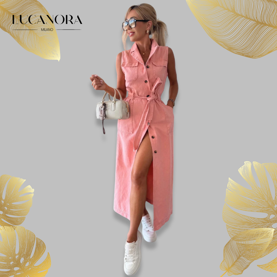 Ez a ruha a legjobbat nyújtja mindkét világból – a gyönyörű megjelenés és a karcsúsító megkötős derékrész kombinációját. Ujjatlan szabású, testet követő sziluettel, amely ott simul, ahol kell, anélkül hogy túl szoros lenne. Legyen szó késői ebédről vagy hétvégi sétáról, ez egy egyszerű választás, ami vagányan mutat.