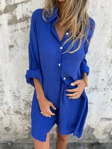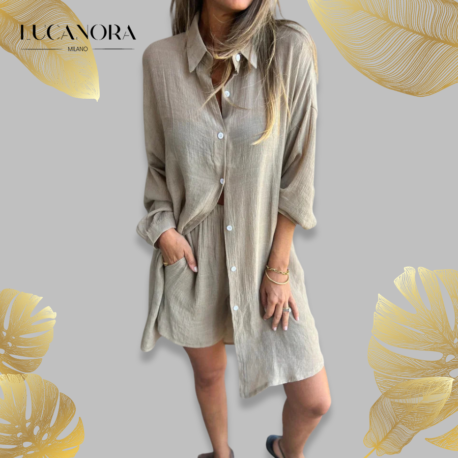 Ez az oversize, hosszú ujjú ingből és magas derekú, kényelmes sortból álló szett a tökéletes egyensúlyt teremti meg a lazán otthonos és a kifinomultan elegáns megjelenés között. Akár kávézni mész, elintéznivalóid vannak, vagy csak otthon pihensz, ez a darab azt az érzést kelti: „nem is próbáltam, mégis fantasztikusan nézek ki.”
